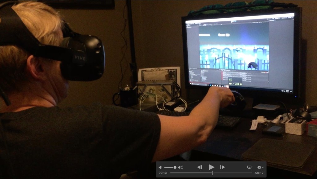 I got a working version of the gaming going for the Vive! I’m very proud of myself. Pam tries to take me down a notch by giving the beta a test run 😉 Unity asset store for the win. #unity3D #unityassetstore